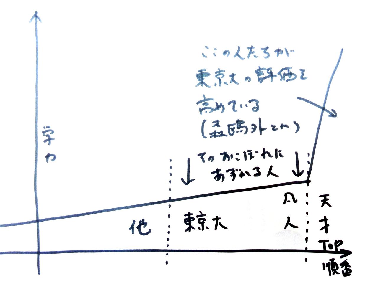 謙虚になる理由のもう一つが、東京大に入って早い段階で 「あ、天才って本当にいるんだ(=自分は天才じゃなかったんだ)」 と、思い知らされます。全国から集まった元神童たちのほぼ全てが、自分が凡人であったと気付きます。僕の周りでも