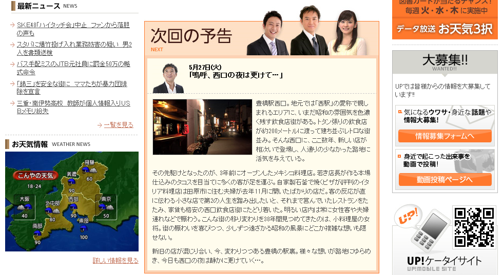 なんと、この記事がきっかけで今回の特集に繋がったということ!豊橋駅西口。地元では「西駅」の愛称で親しまれるエリアに、いまだ昭和の雰囲気を色濃く残す飲食店街がある。トタン張りの飲食店が約200メートルに渡って建ち並ぶレトロな街並み。そんな西口に、ここ数年、新しい店が相次いで登場し、人通りの少なかった路地に活気を与えている。その先駆けとなったのが、3年前にオープンしたメキシコ料理店。若き店長が作る本場仕込みのタコスを目当てに多くの客が足を運ぶ。自家製石釜で焼くピザが評判のイタリア料理店は田原市に住む夫婦が去年11月に開いたばかりの店だ。客の反応が直に伝わる小さな店で第2の人生を踏み出したいと、それまで営んでいたレストランをたたみ、家賃も格安の西口飲食店街にたどり着いた。明るい店内は常に女性客や夫婦連れなどで賑わう。こんな街の移り変わりを38年間見つめてきたのは、小料理屋の女将。街の賑わいを喜びつつ、少しずつ遠ざかる昭和の風景にどこか複雑な想いも隠せない。新旧の店が混じり合い、今、変わりつつある豊橋の駅裏。様々な想いが路地にゆらめき、今日も西口の夜は静かに更けていく…。次回の予告 5月27日(火) 「嗚呼、西口の夜は更けて…」 http://www.nagoyatv.com/up/