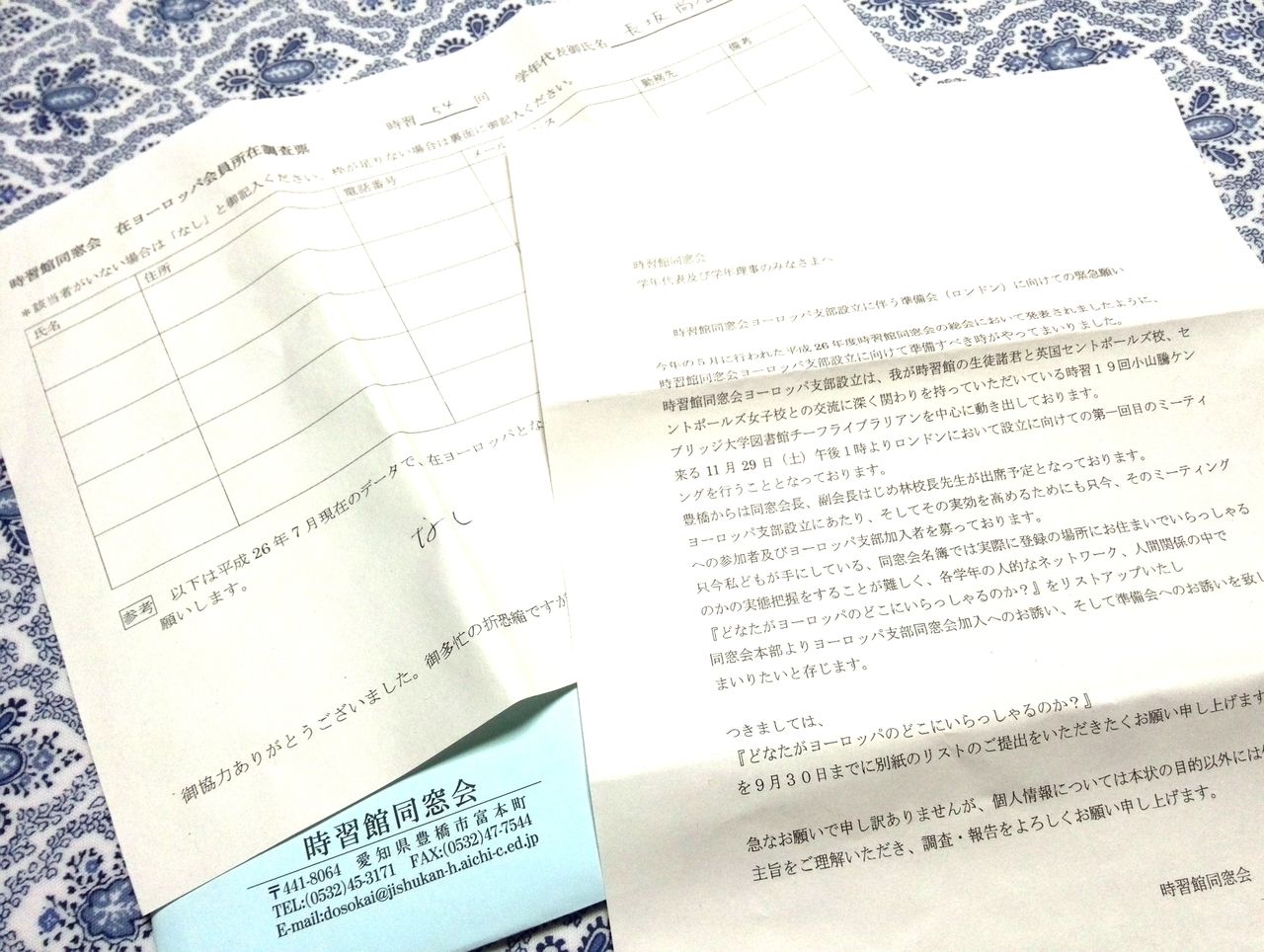 時習館同窓会学年代表及び学年理事のみなさまへ時習館同窓会ヨーロッパ支部設立に伴う準備会(ロンドン)に向けての緊急願い今年の5月に行われた平成26年度時習館同窓会の総会において発表されましたように、時習館同窓会ヨーロッパ支部設立に向けて準備するときがやってまいりました。時習館同窓会ヨーロッパ支部設立は、我が時習館の生徒諸君と英国セントポールズ校、セントポールズ女子校との交流に深く関わりを持っていただいている時習19回小山騰ケンブリッジ大学図書館チーフライブラリアンを中心に動き出しております。来る11月29日(土)午後1時よりロンドンにおいて設立に向けての第一回目のミーティングを行うこととなっております。豊橋からは同窓会長、副会長はじめ校長先生が出席予定となっております。ヨーロッパ支部設立にあたり、そしてその実効を高めるためにも只今、そのミーティングへの参加者及びヨーロッパ支部加入者を募っております。只今私どもが手にしている、同窓会名簿では実際に登録の場所にお住まいでいらっしゃっるのかの実態把握をすることが難しく、各学年の人的なネットワーク、人間関係の中で『どなたがヨーロッパのどこにいらっしゃるのか?』をリストアップいたし同窓会本部よりヨーロッパ支部同窓会加入へのお誘い、そして準備会へのお誘いを致してまいりたいと存じます。つきましては、『どなたがヨーロッパのどこにいらっしゃるのか?』を9月30日までに別紙のリストのご提出をいただきたくお願い申し上げます。急なお願いで申し訳ありませんが、個人情報については本状の目的以外には使用いたしません。趣旨をご理解いただき、調査・報告をよろしくお願い申し上げます。時習館同窓会 幹事長