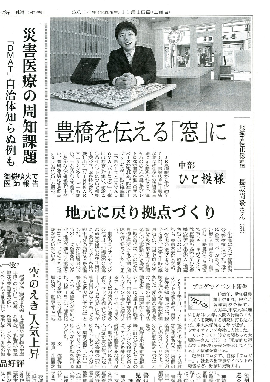 ご無沙汰してます。土曜日の日経夕刊でご雄姿、拝見しました。「豊橋伝える『窓』」って、いい表現ですね。ご自身が主役でなく、あくまで主役は街であり、そこに住む人だ、という長坂さんの姿勢が感じられ、COOLです。豊橋は、名古屋からちょっと遠くて日常的には足を運びにくいのですが、また面白い話あったら教えてください。ますますのご活躍を!