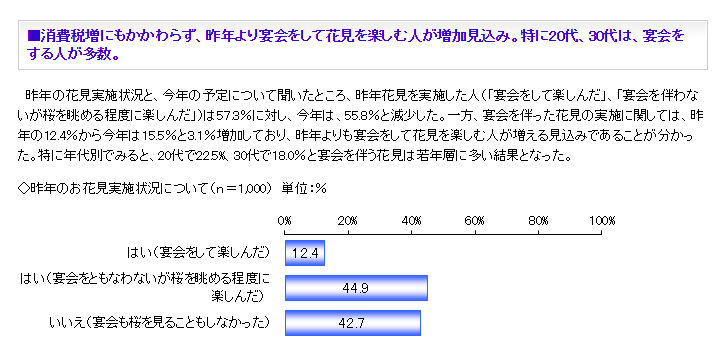 まじか。 投票率は59.32%、負けた。昨年花見を実施した人(「宴会をして楽しんだ」、「宴会を伴わないが桜を眺める程度に楽しんだ」)は57.3%
