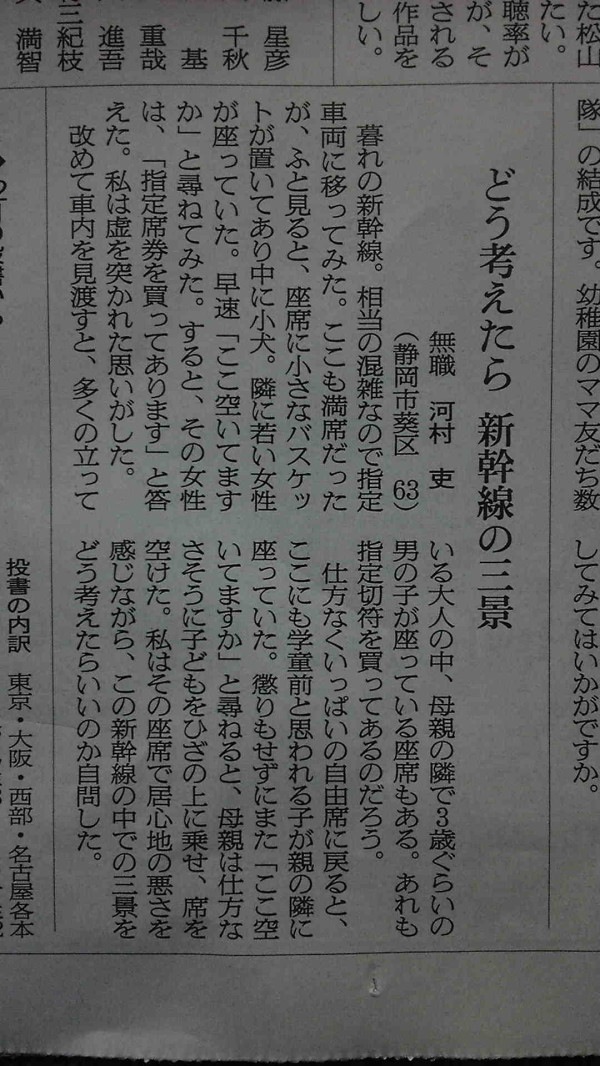 僕も、虚を突かれた思いがしました。 ネットで、散々叩かれていたのですが、改めて、この河村さんは、本当にそこまでのことをしたのかと。【どう考えたら 新幹線の三景】 無職 河村 吏 (静岡市葵区 63)暮れの新幹線。相当の混雑なので指定車両に移ってみた。ここも満席だったが、ふと見ると、座席に小さなバスケットが置いてあり中に小犬。隣に若い女性が座っていた。早速「ここ空いてますか」と尋ねてみた。すると、その女性は、「指定席券を買ってあります」と答えた。私は虚を突かれた思いがした。改めて車内を見渡すと、多くの立っている大人の中、母親の隣で3歳ぐらいの男の子が座っている座席もある。あれも指定切符を買ってあるのだろう。仕方なくいっぱいの自由席に戻ると、ここにも学童前と思われる子が親の隣に座っていた。懲りもせずにまた「ここ空いてますか」と尋ねると、母親は仕方なさそうに子どもをひざの上に乗せ、席を空けた。私はその座席で居心地の悪さを感じながら、この新幹線の中での三景をどう考えたらいいのか自問した。- 私「ここ空いてますか」 女性「指定席券を買ってあります」 新幹線で、私は虚を突かれた思いがした http://alfalfalfa.com/archives/7735288.html