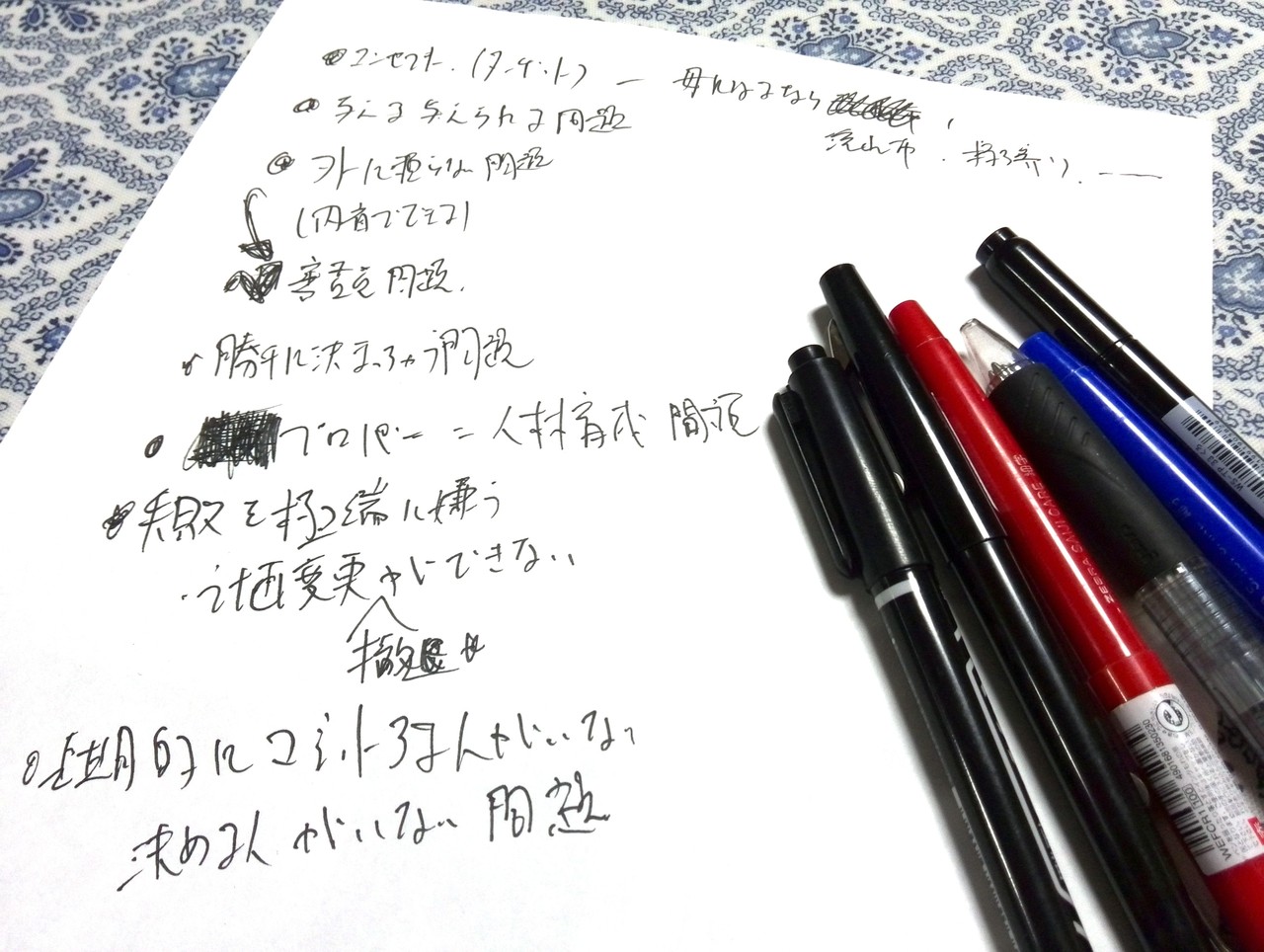 僕が普段言いたい(書きたい)ことは、だいたいブログにアップしているので、その中からどれを使って、どういう順に並べて行くかを考える作業です。 これは手書き。 字が汚いですが、直筆です。 これは、プレゼン考えるときも同じです。