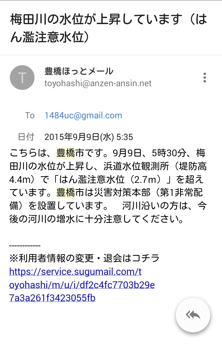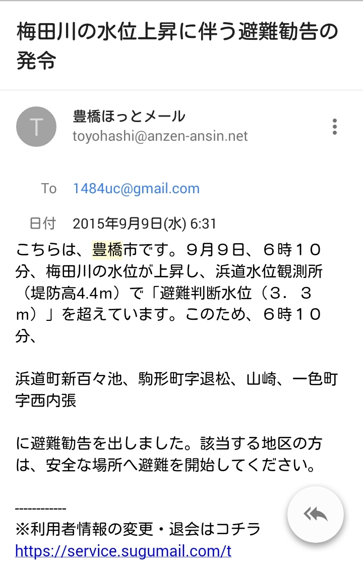 梅田川が「避難判断水位」を超え、避難勧告が発令