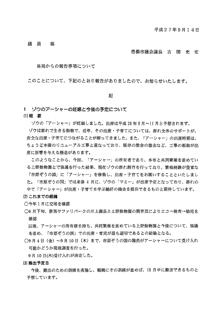 ■1.ゾウのアーシャーの妊娠と今後の予定について(1)概要ゾウの「アーシャー」が妊娠しました。 出産は平成28年度9月~11月と予想されます。ゾウは群れで生きる動物で、近年、その出産・子育てについては、群れ全体のサポートが安全な出産・子育てにつながることが解ってきました。また、「アーシャー」の出産時期は、ちょうど本年のリニューアル工事と重なっており、既存の獣舎の撤去など、工事の振動が出産に影響を与える概念があります。このようなことから、今回、「アーシャー」の所有者であり、本市と共同繁殖を進めている上野動物園とで協議を行った結果、現在ゾウの群れ飼育を行っており、繁殖経験が豊富な「市原ぞうの国」に「アーシャー」を移動し、出産・子育てをお願いすることといたしました。「市原ぞうの国」では来春4月に、ゾウの「マミー」が出産予定となっており、群れの中で「アーシャー」が出産・子育てを学ぶ絶好の機会を提供できるものと期待しています。(2)これでの経緯◯今月1月に交尾を確認◯6月下旬、群馬サファリパークの川上園長と上野動物園の飼育員によりエコー検査→胎児を確認以後、アーシャーの所有権を持ち、共同繁殖を進めている上野動物園と今後について、協議を進め、「市原ぞうの国」での出産・育児が最も適切であるとの結論となる。◯9月4日(金)~9月10日(木)まで、市原ぞうの国の職員がアーシャーについて受け入れ可能かどうか現地調査を行った。9月10日(木)受け入れが決定した。(3)搬出予定日今後、搬出のための訓練を実施し、順調にその訓練が進めば、10月中に搬送できるものと予想しています。