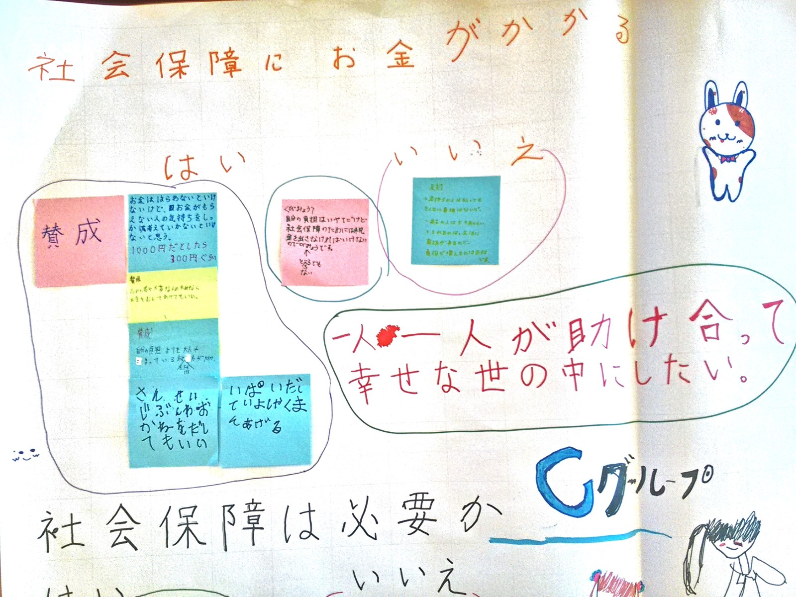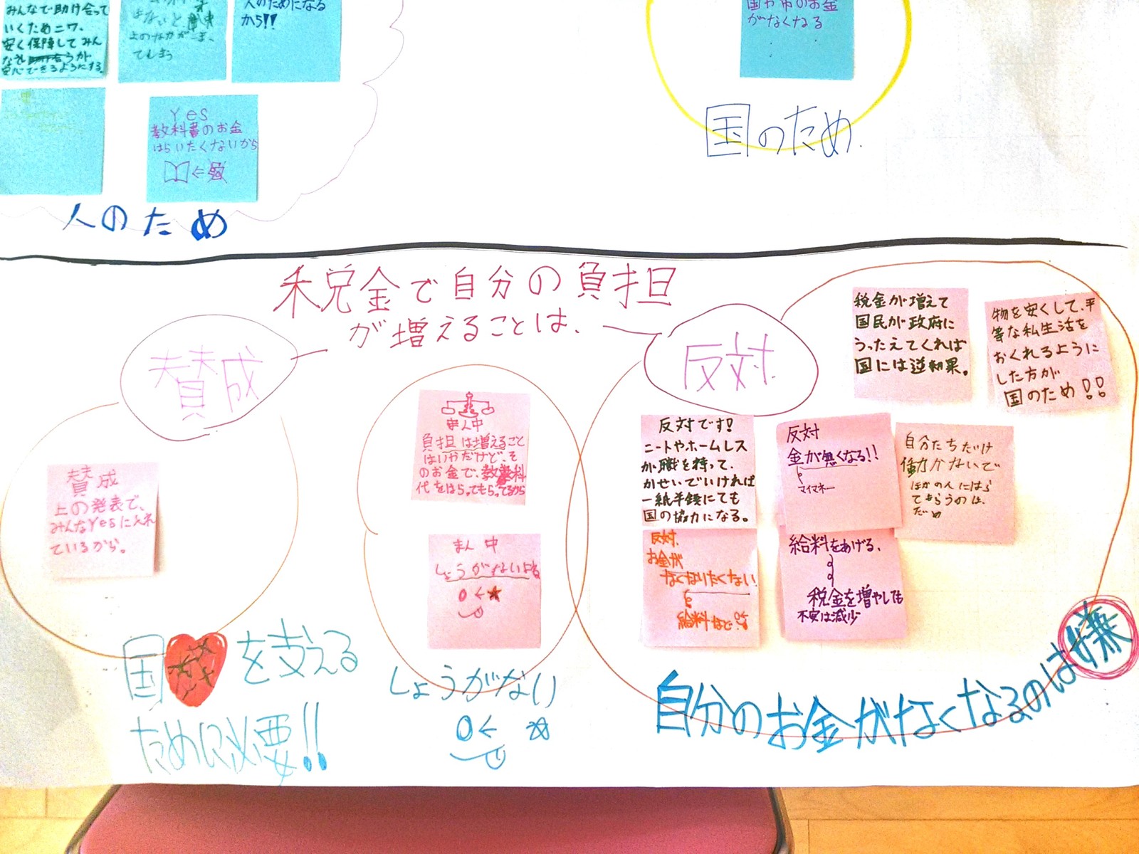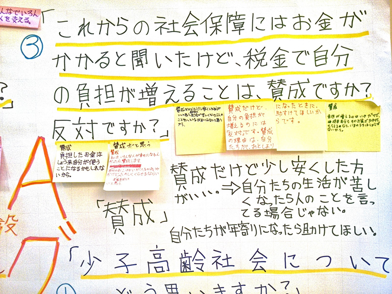言っても、こういうところに集まる(呼ばれる)児童生徒たちなので、お利口さんで、 「賛成、高齢者や障害をもっている人のためにはしょうがない」みたいな回答に偏ると思っていました、主催も医療法人・社会福祉法人だし。