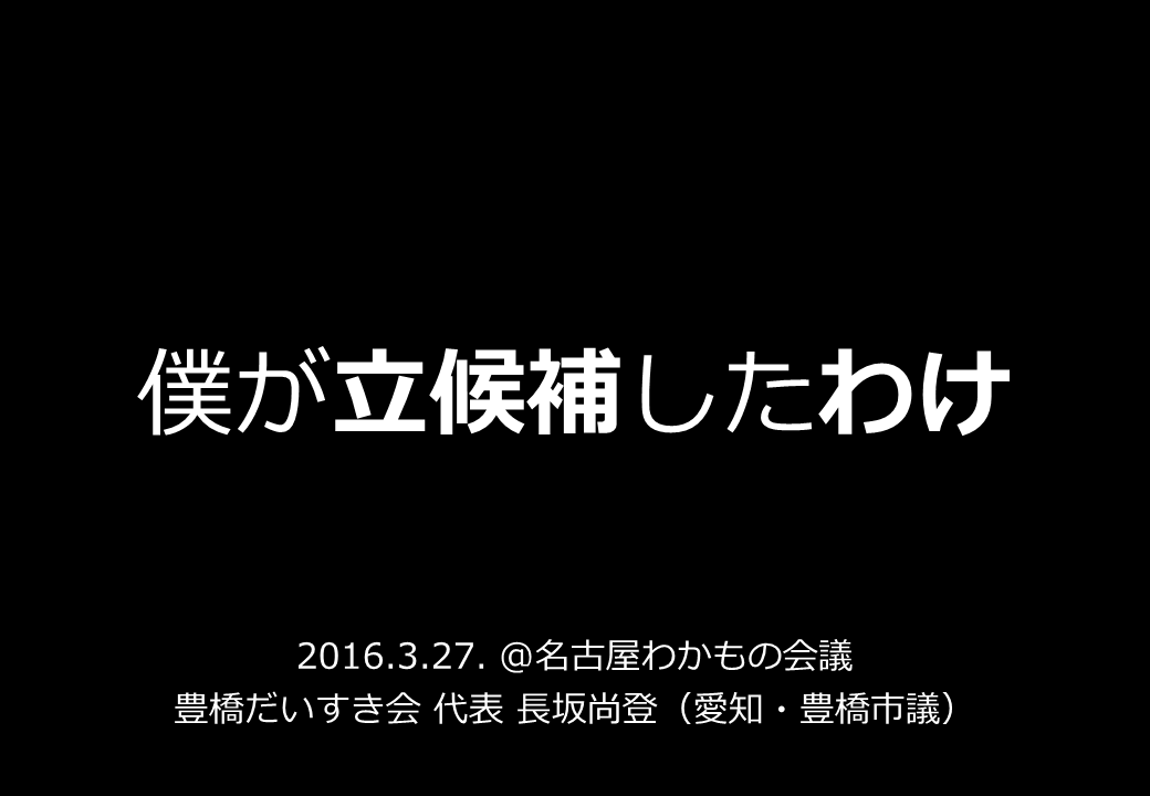 - 若き政治家につきつけられる禅問答、政治活動とは - 愛知豊橋・長坂なおと のblog「ショートプレゼンテーション」と言われていたので、がっつりパワポを用意していったのですが、なんとスライド用意してきたのは、僕だけ。