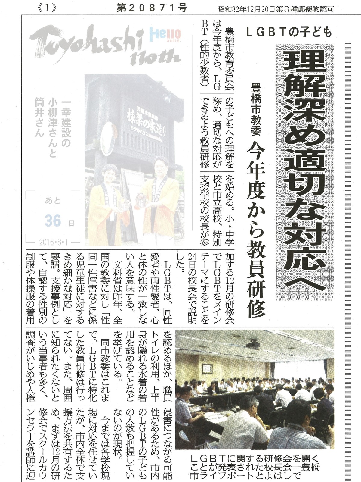 豊橋市教育委員会は今年度から、LGBT(性的少数派)の子どもへの理解を深め、適切な対応ができるよう教員研修を始める。(略)「パートナーシップ証明書」や「フレンドリー宣言」のような派手さはありませんが、まちづくりの全ての根源は、人と教育です。 この取組は長期的に見て、豊橋をとてもよいまちにするでしょう。