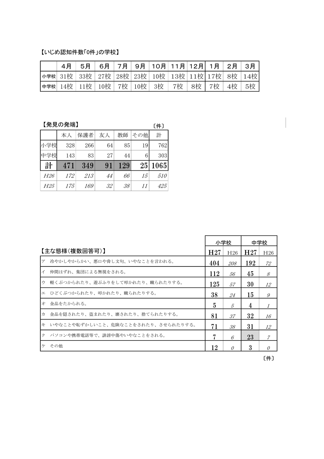 今回、資料として「平成27年度 いじめ認知件数調査(4~3月)のまとめ」が添付されていたので、もう少し詳しく見ていきます。