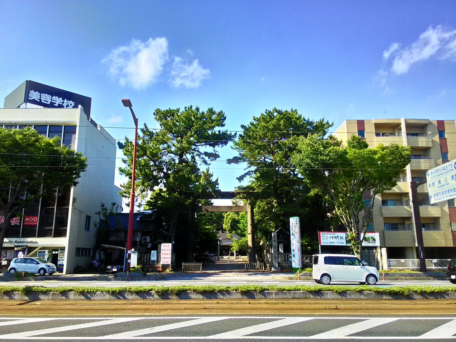 「豊橋公園前」から写真を撮るとこんな感じ(矢印が神社)