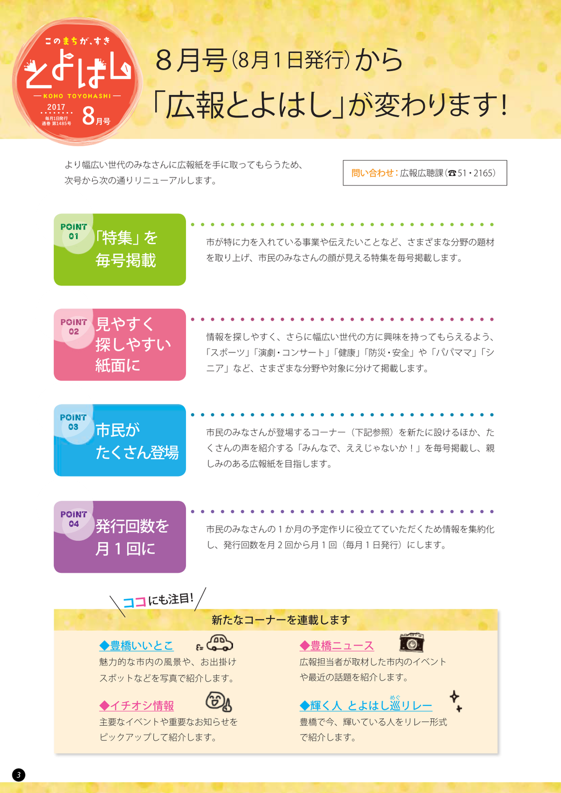 最大のポイントは「4.発行回数を月 1 回に」でしょう。1.「特集」を毎号掲載市が特に力を入れている事業や伝えたいことなど、さまざまな分野の題材を取り上げ、市民のみなさんの顔が見える特集を毎号掲載します。2.見やすく探しやすい紙面に情報を探しやすく、さらに幅広い世代の方に興味を持ってもらえるよう、「スポーツ」「演劇・コンサート」「健康」「防災・安全」や「パパママ」「シニア」など、さまざまな分野や対象に分けて掲載します。3.市民がたくさん登場市民のみなさんが登場するコーナー(下記参照)を新たに設けるほか、たくさんの声を紹介する「みんなで、ええじゃないか!」を毎号掲載し、親しみのある広報紙を目指します。4.発行回数を月 1 回に市民のみなさんの 1 か月の予定作りに役立てていただくため情報を集約化し、発行回数を月 2 回から月 1 回(毎月 1 日発行)にします。