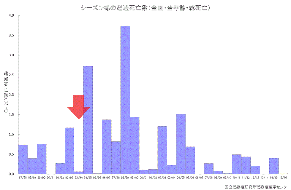 集団予防接種が低迷した1988年-94年から死亡率が増えたというデータがある一方、