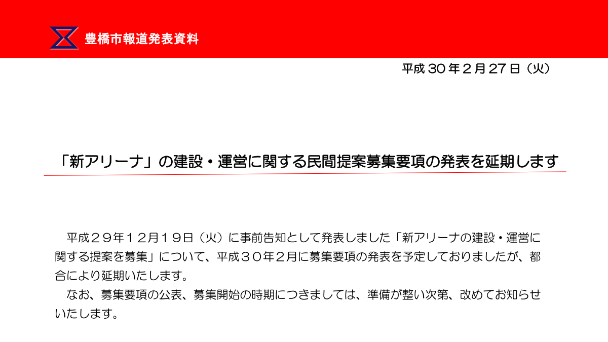 さて、2月27日(火)に予定されていた、新アリーナの公募要項の発表が延期になりました。