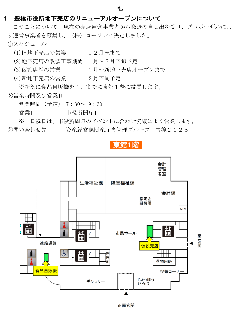 営業時間が19時半まで延長されること、イベント時には土日祝の営業もありえること、より便利になりそうです。1.スケジュール(1)旧地下売店の営業 12月末まで(2)地下売店の改装工事期間 1月~2月下旬予定(3)仮設店舗の営業 1月~新地下売店オープンまで(4)新地下売店の営業 2月下旬予定※新たに食品自販機を4月までに東館1階に設置します。2.営業時間及び営業日営業時間(予定) 7:30~19:30営業日 市役所開庁日※土日祝日は、市役所周辺のイベントに合わせ協議により営業します。
