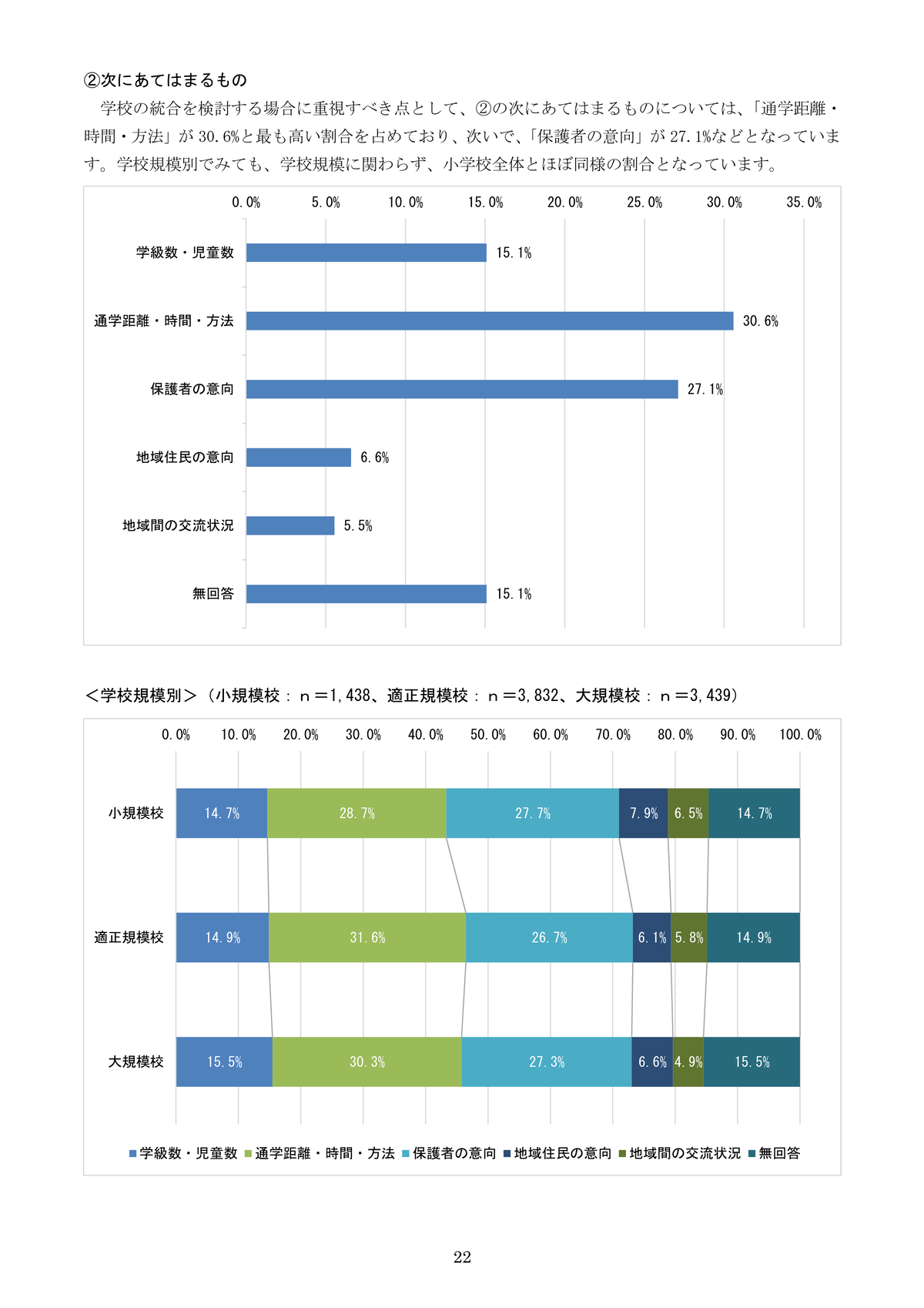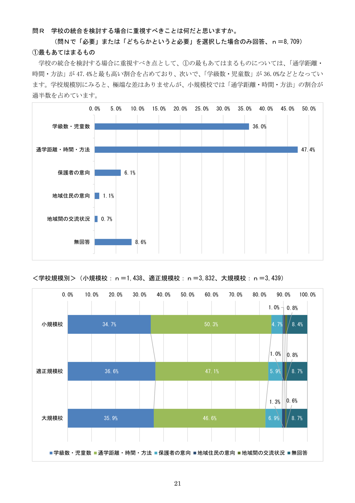 地域によっては、保護者は子どもに適度な競争を経験させたい、多くの友人関係の中で育てたいという意向から統合に賛成している一方、地域住民が、地域の中に学校を残してほしいという意向から統合に反対し、意見のずれが生じる場合もある。とあり、当たり前ですが今回の調査は保護者対象のため「地域住民の意向」を重視することが、非常に小さい結果となりました。