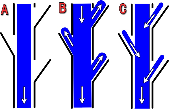 霞堤の図|A-通常時,B-洪水時,C-洪水後