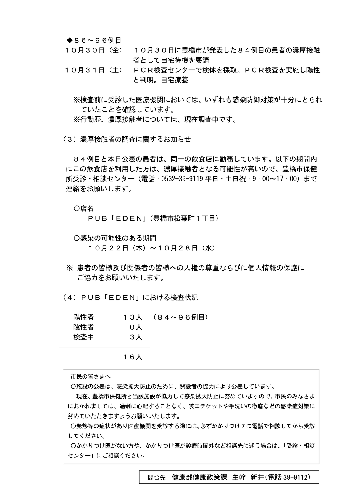 84例目と本日公表の患者は、同一の飲食店に勤務しています。以下の期間内にこの飲食店を利用した方は、濃厚接触者となる可能性が高いので、豊橋市保健所受診・相談センター(電話:0532-39-9119(平日・土日祝9:00~17:00))までご連絡ください。
