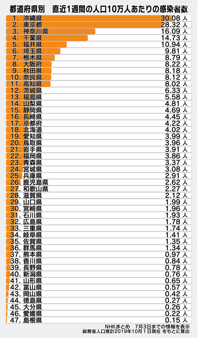 1位の緊急事態宣言中の沖縄が微減する一方、東京や神奈川が増加しています。