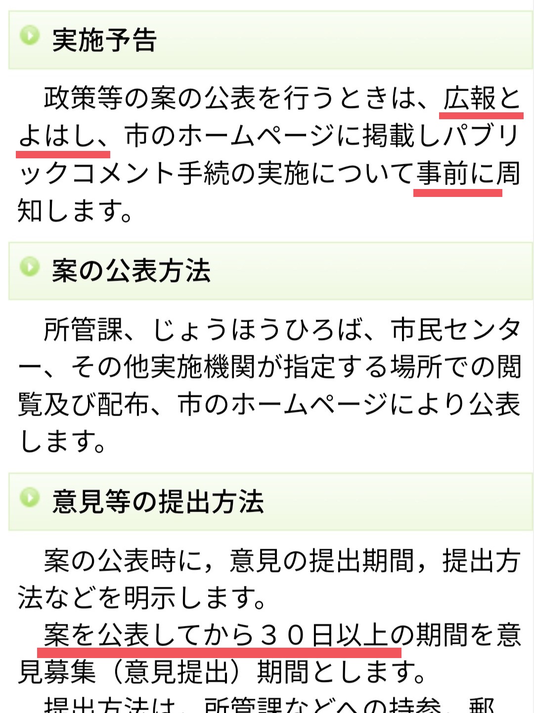 現段階において多くのご意見をいただいていますが、広く周知するため広報とよはし7月号に意見募集の記事を掲載することにしました。と、良いように書かれていますが、実際は内規に従っていないことが指摘されています。