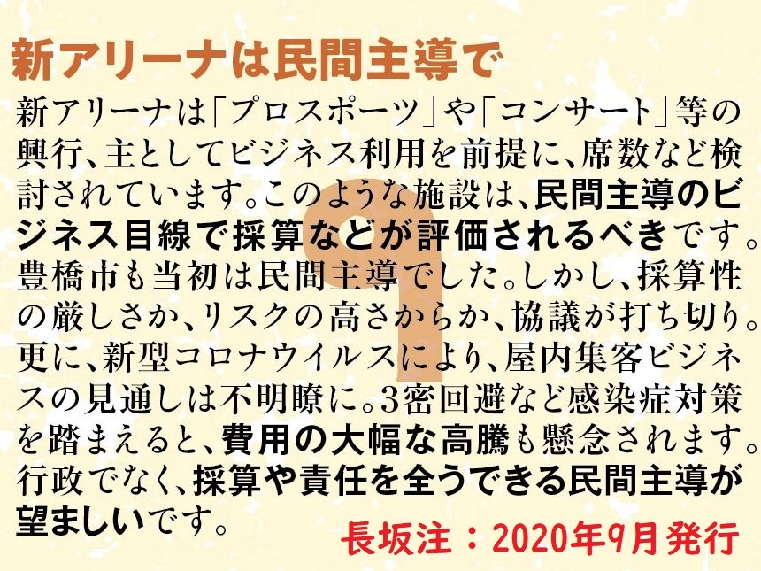 新アリーナは「プロスポーツ」や「コンサート」等の興行、主としてビジネス利用を前提に、席数など検討されています。このような施設は、民間主導のビジネス目線で採算などが評価されるべきです。豊橋市も当初は民間主導でした。しかし、採算性の厳しさか、リスクの高さからか、協議が打ち切り。更に、新型コロナウイルスにより、屋内集客ビジネスの見通しは不明瞭に。3密回避など感染症対策を踏まえると、費用の大幅な高騰も懸念されます。行政でなく、採算や責任を全うできる民間主導が望ましいです。