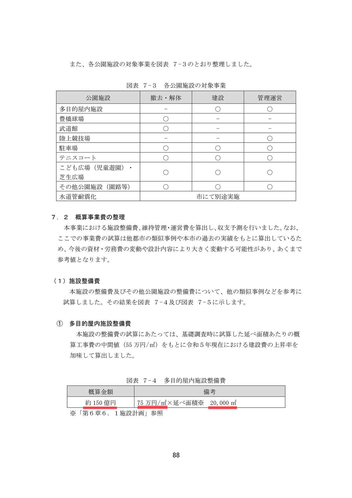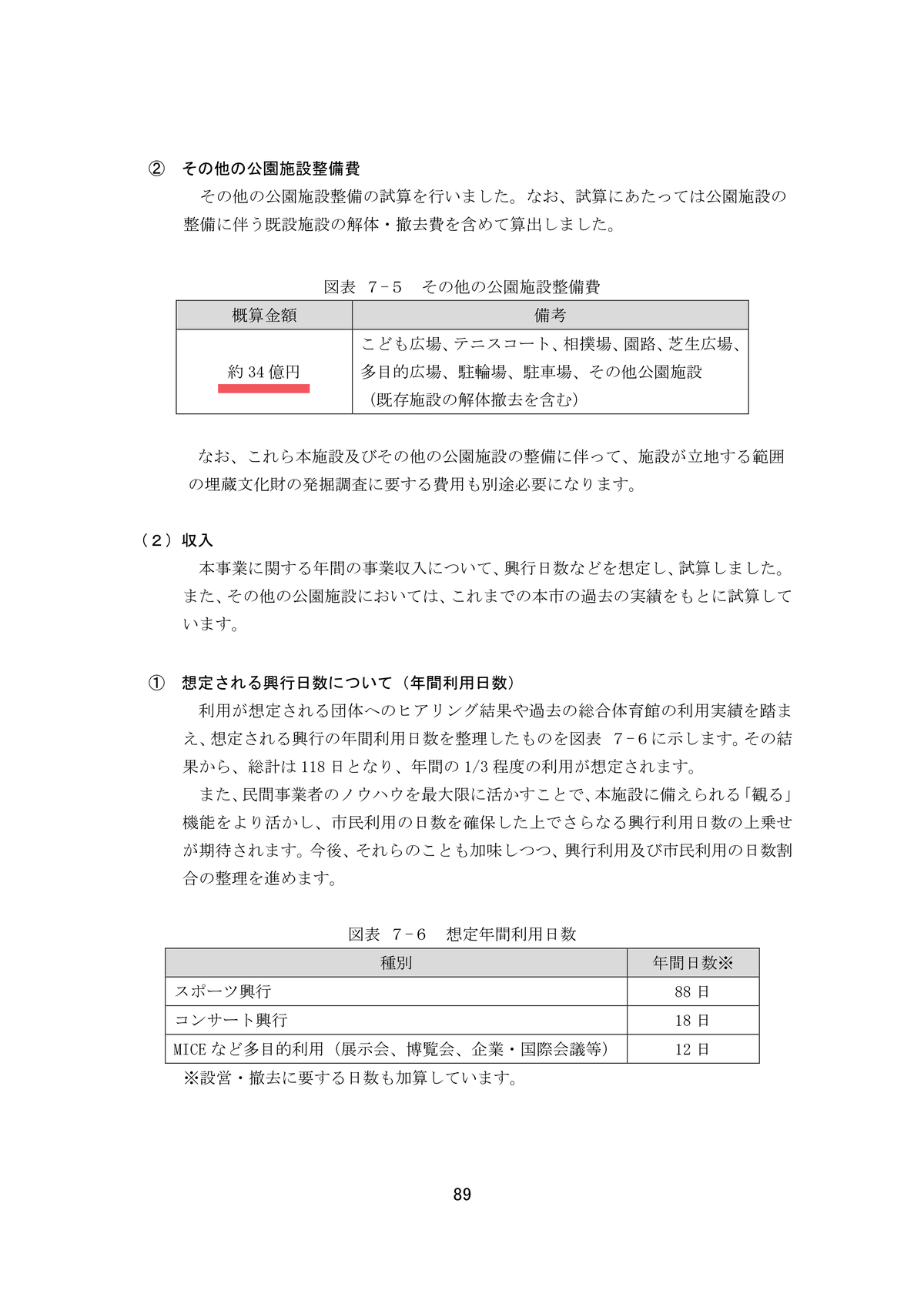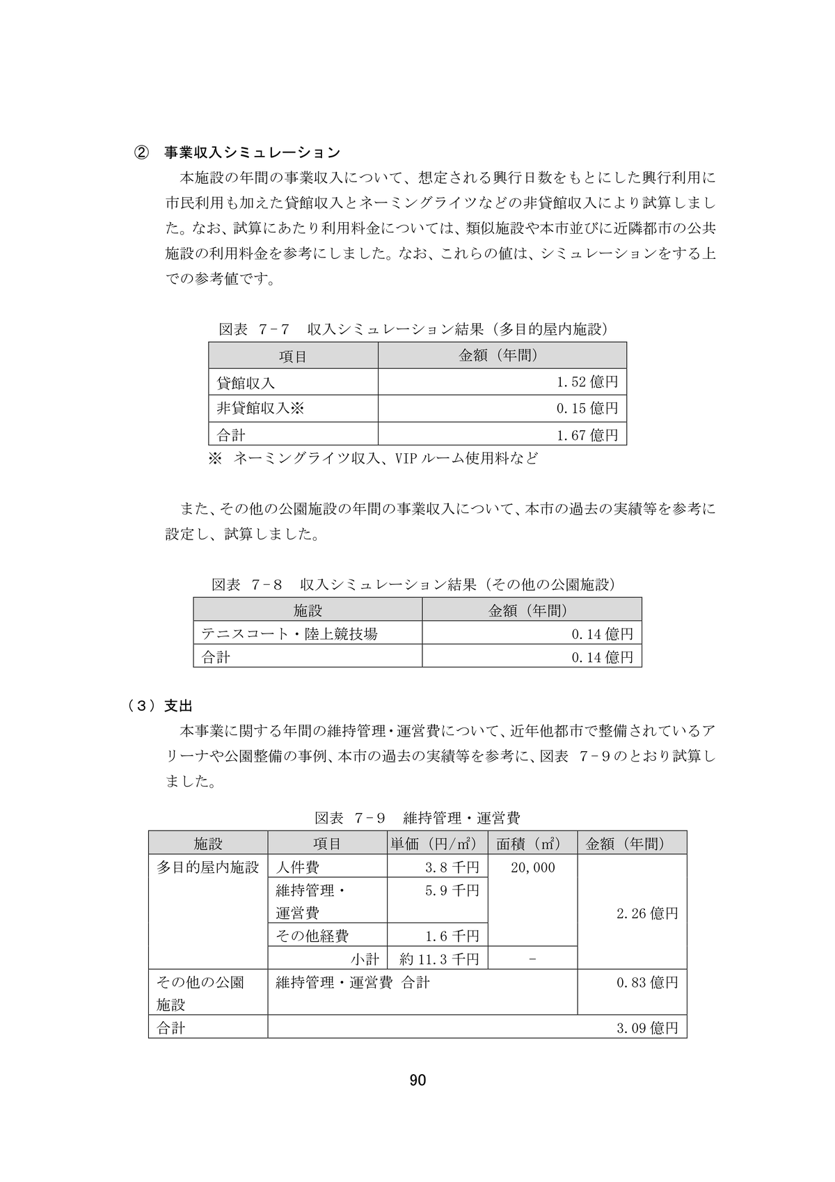 維持管理、運営費についても、基本計画でお示ししました収支シミュレーションの手法をベースに、多目的屋内施設はBTコンセッション方式、その他公園施設はBTO方式として、30年間維持管理・運営を行った場合の事業費を試算し、さらに、PFI事業として必要となるSPC開業費・管理費や民間資金調達に係る割賦金利などの諸費用、物価変動等による増減額を加えた額を、債務負担行為限度額としております。以上でございます。