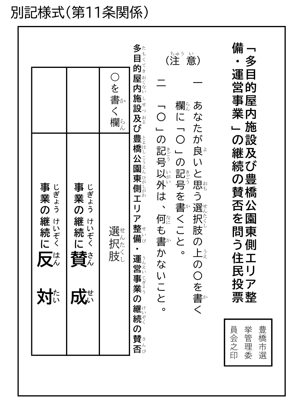 - どうやって投票するの? ⇒ 参院選と同様の投票所にて、投票用紙(下図)の「◯を書く欄」のうち、賛成または反対のどちらかの欄に「◯」を書いて投票します(条例第9条より)。「×」など◯以外を書くと無効です。◯を複数書いても、他の文字を書いても無効です(条例第12条より)